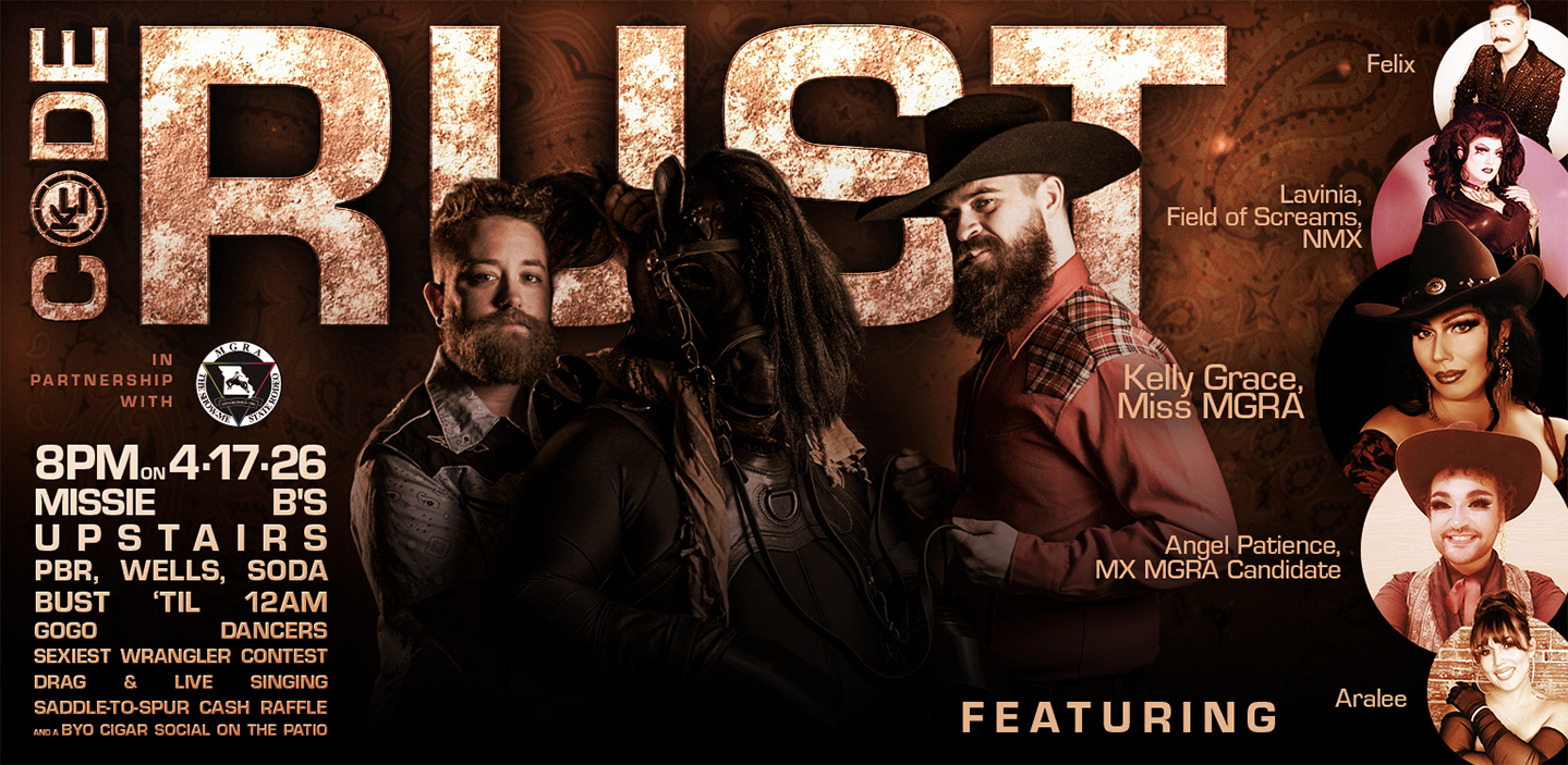 In June, the KC Pioneers kicked off CODE KC with RUST—a gritty, gear-heavy night inspired by the hanky code. Leather folx packed Missie B’s for bondage demos, cowboy heat, and a Saddle to Spur raffle benefiting MGRA. Drink busts flowed, flags flew, and the community showed up strong.